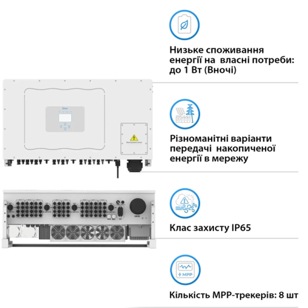 Ефективність: Інвертори Deye відомі своєю високою ефективністю, що дозволяє максимально використовувати сонячну енергію для генерації електроенергії.