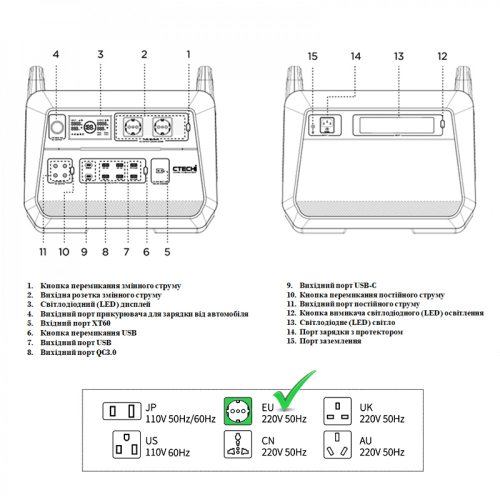 CTECHi ST2000 — це компактний пристрій із 15 різними вихідними портами, включаючи 6 портів USB (2 * USB-A і 4 * USB-A QC3.0), 2 порти Type-C PD, 2 розетки змінного струму, 1 порт CIG і 4 Виходи постійного струму.